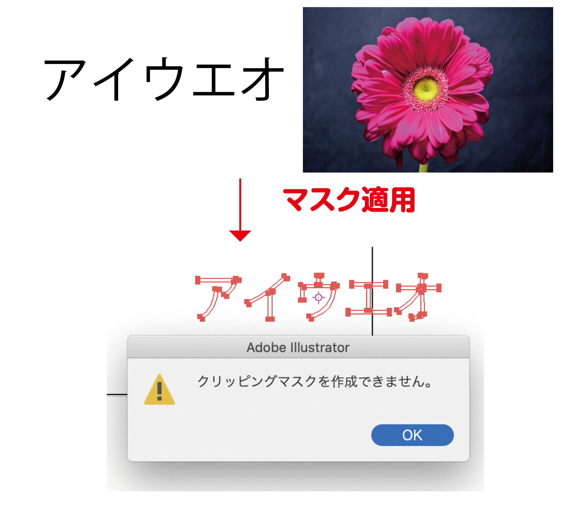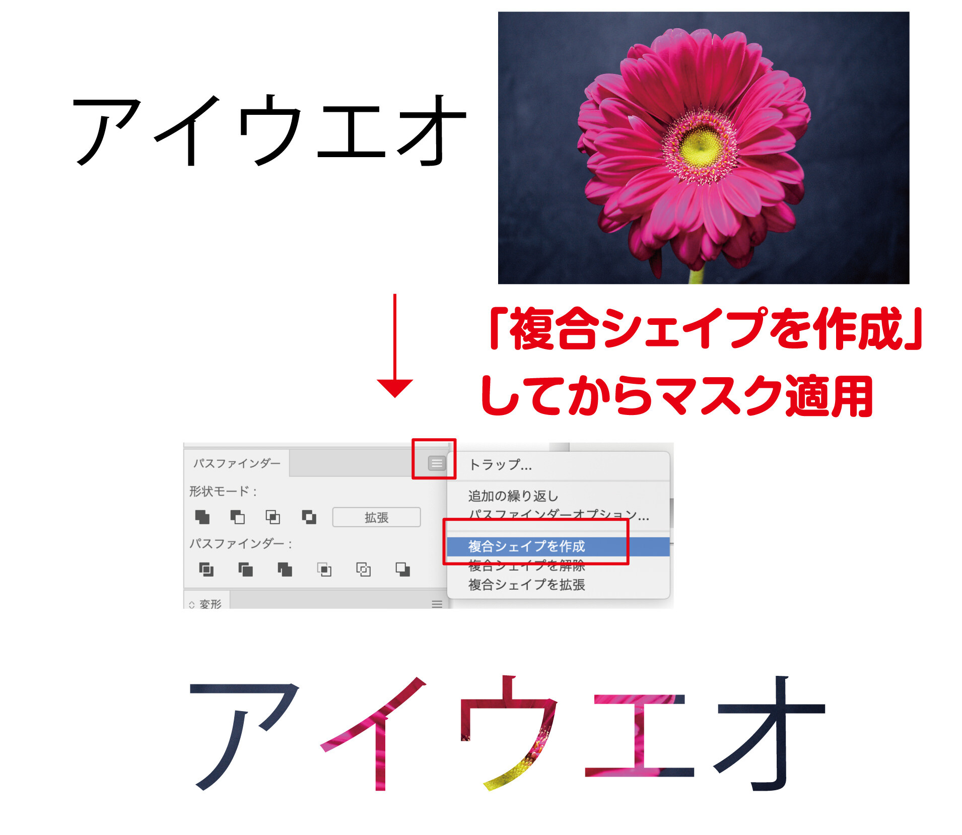 パスファインダーなどで「合体」処理されているものや、2文字以上のアウトラインされたテキストの場合は、前面オブジェクトでのクリッピングマスクができません。