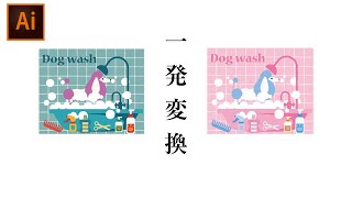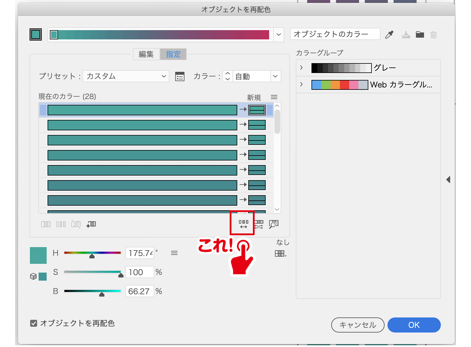 ブレンドが完了したら、オブジェクト全部を選択したまま、上部メニューバー の「編集」→「カラーを編集」→「オブジェクトを再配色」を押しましょう。