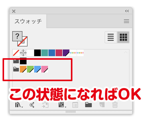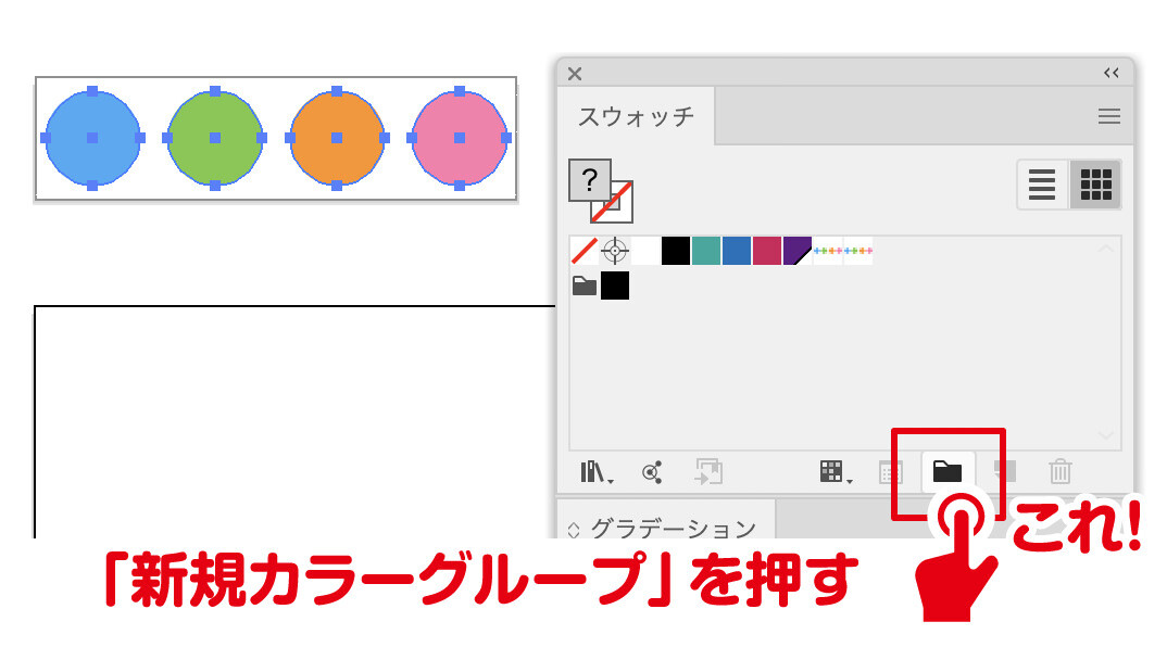 それらの指定色を含んだオブジェクトをまとめて選択し、そのまま「スウォッチパネル」の右下フォルダの「新規カラーグループ」ボタンを押しましょう。