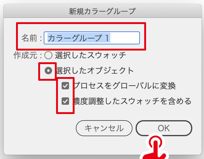 すると、ダイアログが出てきますので、下記画像の設定を確認の上、OKを押しましょう。カラーグループの名前は任意なのでなんでも大丈夫です。