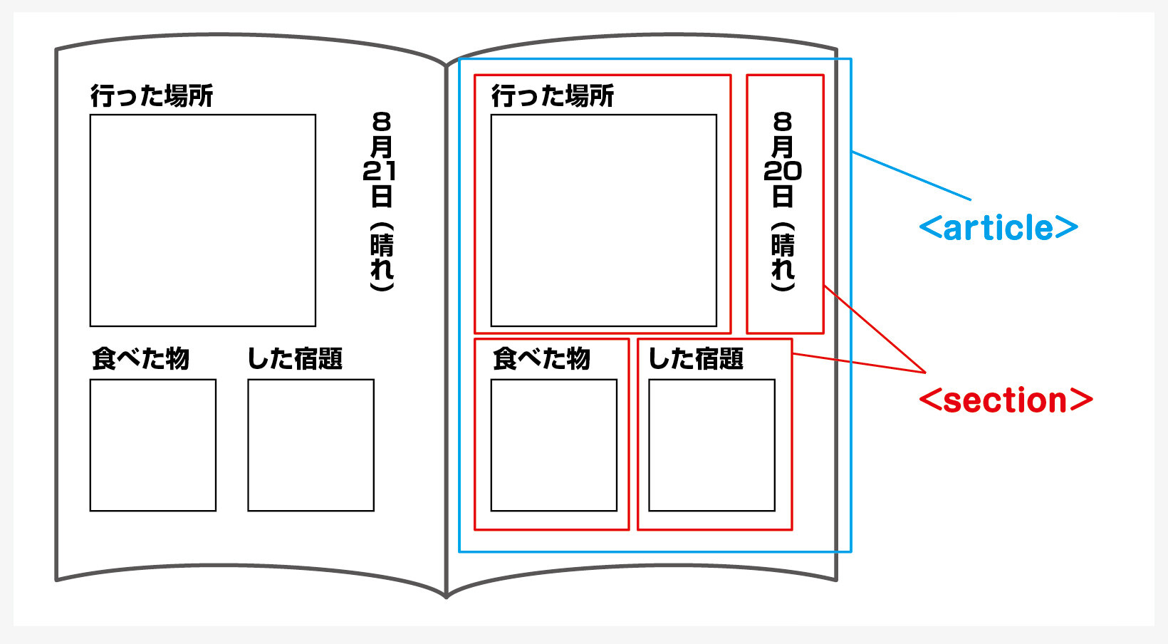 そうすると、その見開き1ページが<article>で囲う内容で、「日付」「行った場所」「食べた物」「した宿題」などを<section>で囲っていくといった雰囲気ですね。