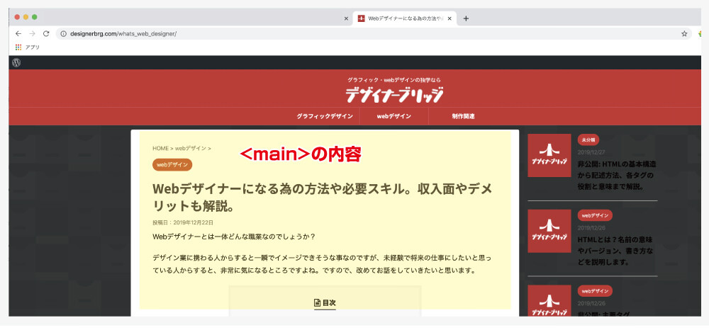 ですので、1つのHTML内に1つしか記述する事しかできず、ヘッダーやフッター、サイドバーも含めて、その子要素としては記述できません。一番伝えたい事が、サイドバーや、フッターにあるのはおかしいですからね。