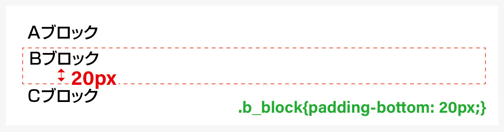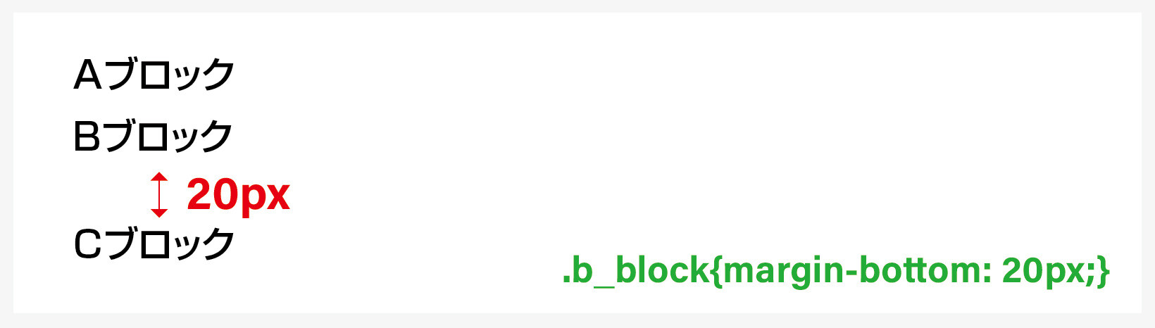 意味 / Bブロックから下方向に隣接するCブロックまでの距離を20pxにします。