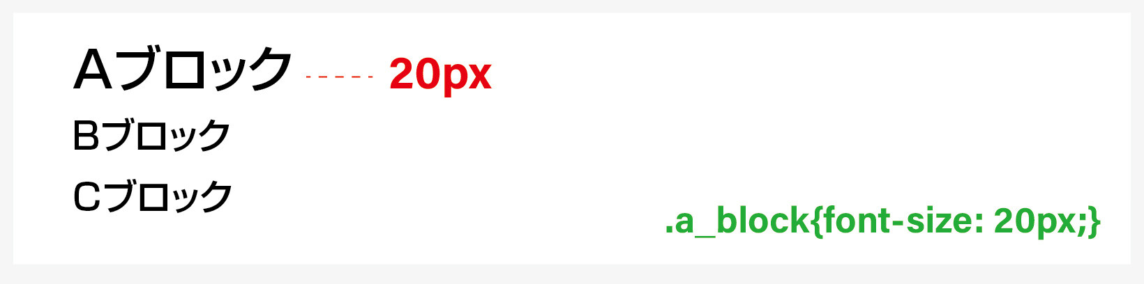 意味 / a_blockクラスのフォントの大きさを20pxにします。