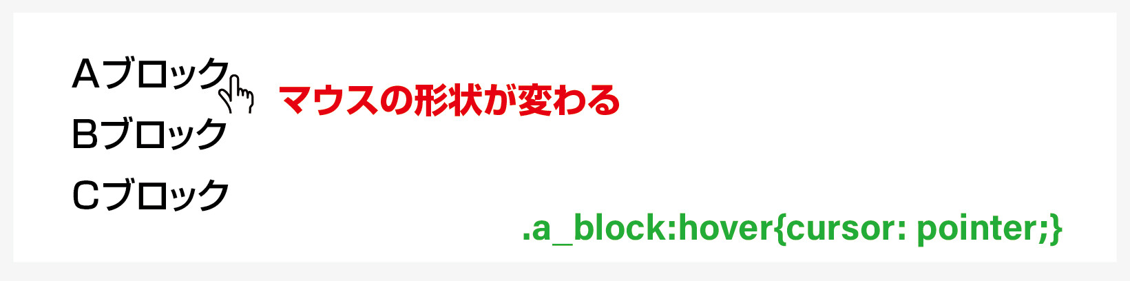 意味 / a_blockクラスの要素の上にカーソルをのせた時、カーソルがポインター(指差し)に変わります。