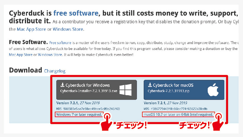 Cyberduckの公式サイトにて、プログラムファイルのダウンロードをしましょう。