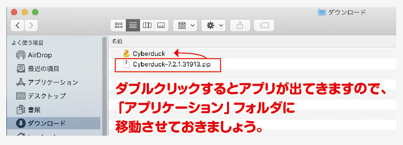 プログラムを解凍し、フォルダをダブルクリックすると、「Cyberduck.app」 が出てきますので、DOCKやアプリケーションフォルダなど、任意の場所に置き直しておきましょう。