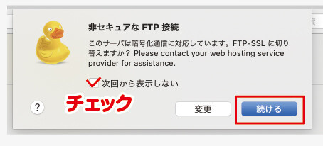 「非セキュアなFTP接続」と出ますが、問題ないので「次回から表示しない」にチェックを入れて「続ける」を押します。