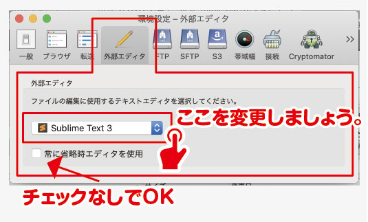 私の場合ですと、Sublime Textになりますのでそちらで設定します。