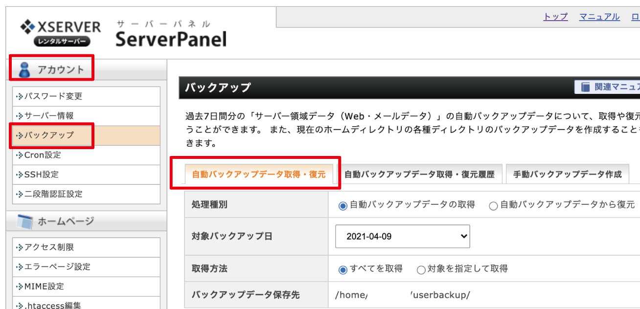 エックスサーバーのサーバーパネルの「アカウント」→「バックアップ」から「自動バックアップデータ取得・復元」というタブがあり、そこから日付と復元したいドメインを取得請求をすれば、指示されたリンクアドレス内にバックアップファイルが生成されます。