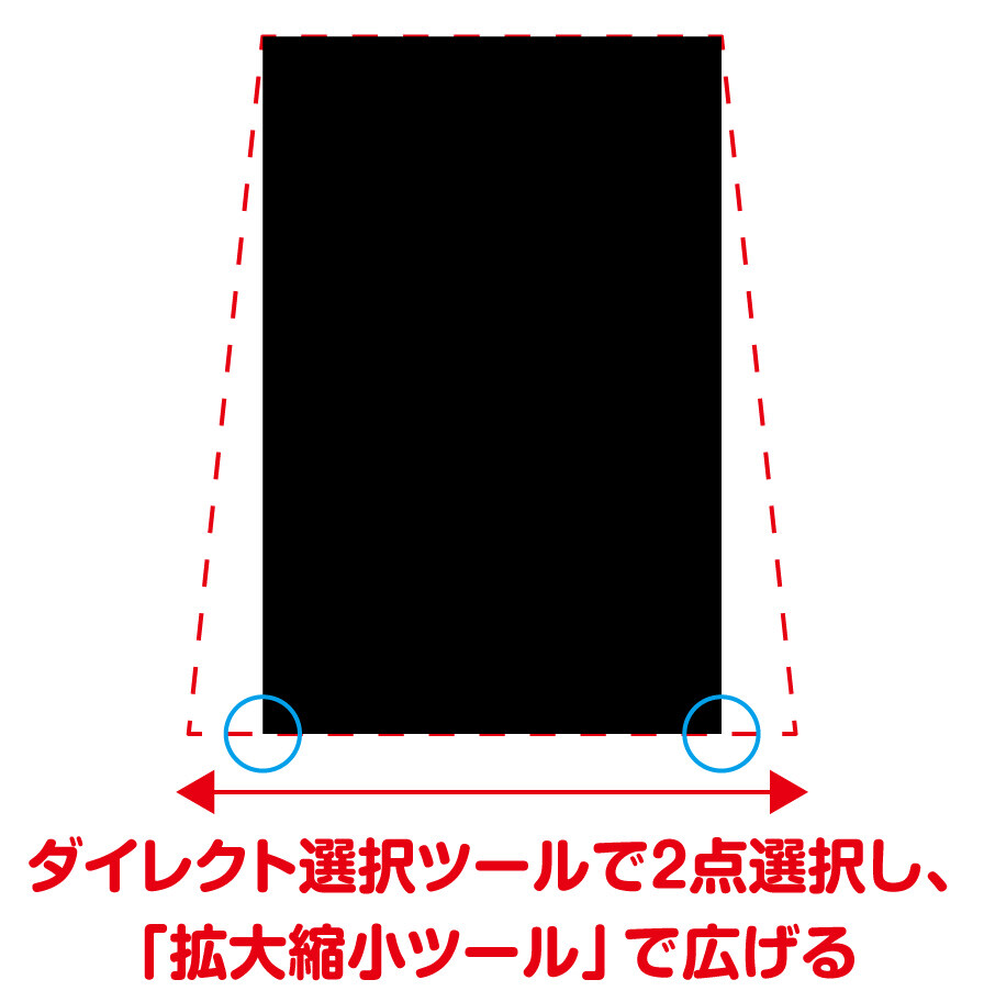 歯車は、大外が細く、内にいくほど太くならないと歯車の機能が成立しませんので、長方形の左右下のアンカーポイントをダイレクト選択ツールで同時に選択した上で、拡大縮小ツールに切り替え、真ん中を中心にした状態(初期のままでOK)で、左右の外側に広がるようにドラッグしましょう。