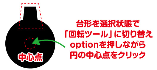 次に、台形を選択状態のまま、「回転ツール」に持ち替え、円の中心とガイドの先端の重なり部分をoptionを押しながらクリックします。