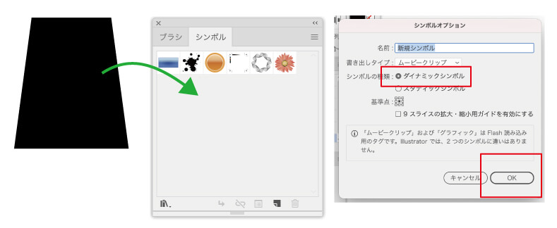 台形を選択し、シンボルパネルの方へドラッグ&ドロップを行い、台形のシンボル化を行います。