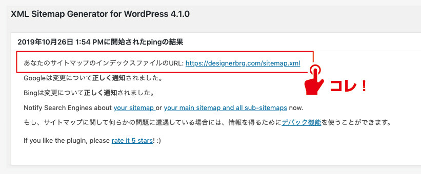「検索エンジンはまだ通知されていません」では特にやる事はないのですが、後々ここに書かれている「あなたのサイトマップのインデックスファイルのURL: https://designerbrg.com/sitemap.xml」というのが重要になってくるので、この点覚えておきましょう。