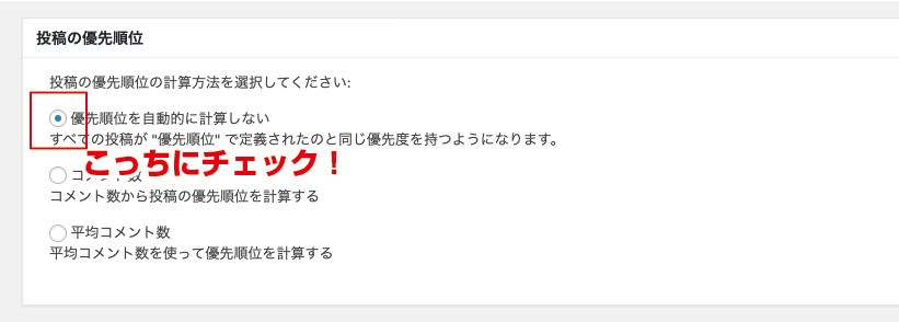 「コメント数」が多いページを優先的に巡回してもらう必要はないので、「優先順位を自動的に計算しない」にチェックを入れましょう。