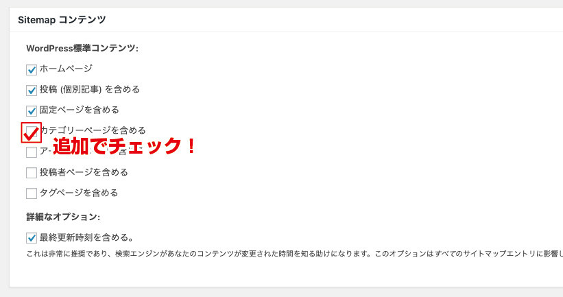 基本的には、コンテンツは多いにこした事はないのですが、質の悪いページに関してはマイナス評価になりますので、デフォルトの状態に「カテゴリーページ」だけ含めてチェックを入れておきましょう。