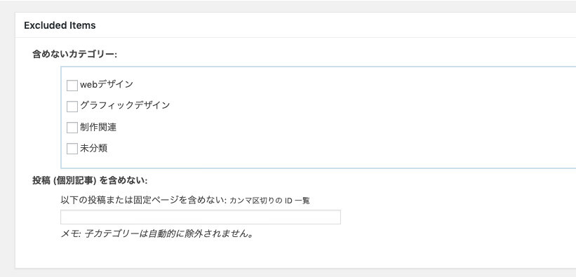 「Excluded Items」は、「上記で許可をしたけれども、厳密には一部これは除きたい」というものをピックアップして拒否することができ、サイトマップに含めたくないカテゴリーや投稿記事、固定ページなどを指定することができます。