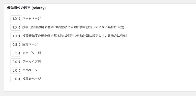 「優先順位の設定 (priority)」では、相対的なサイトの重要度を聞かれています。
