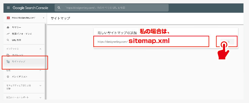 私の場合は、「あなたのサイトマップのインデックスファイルのURL: https://designerbrg.com/sitemap.xml」と書かれていますので、「sitemap.xml」と入力します。