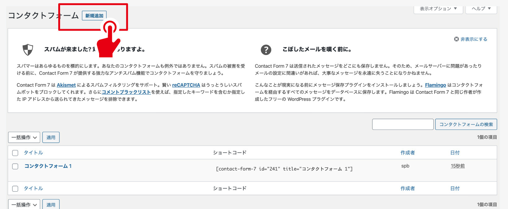 それではContact Form 7の設定をしていきましょう。まずはわかりやすいように、上部の「新規追加」のボタンを押しましょう。