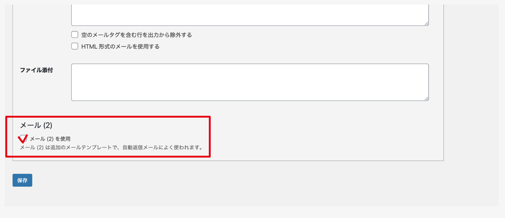 先ほどまで編集していた「メール」タブ内の「保存」ボタンの上に「メール(2)」というのがありますので、「メール (2) を使用」にチェックを入れましょう。