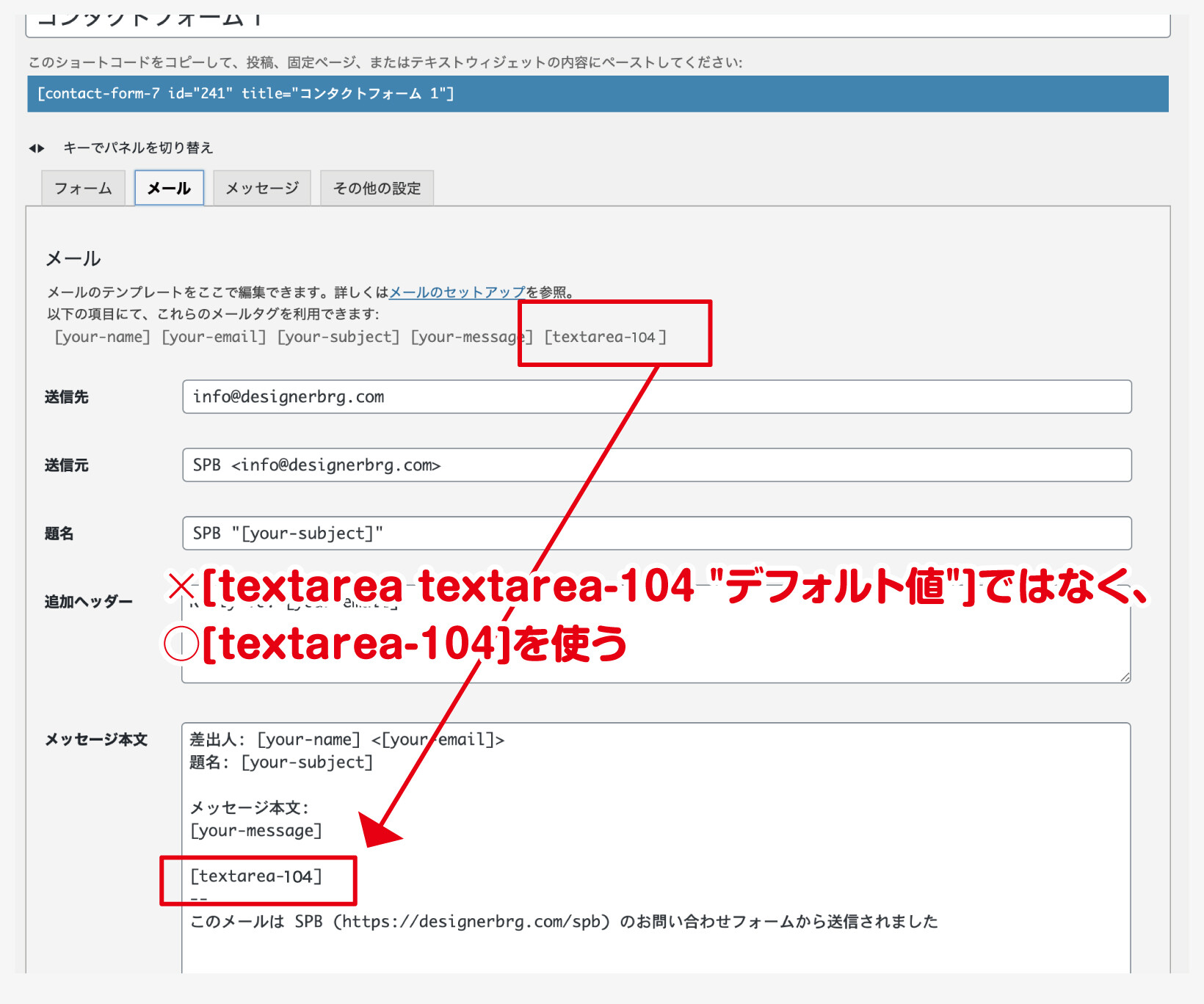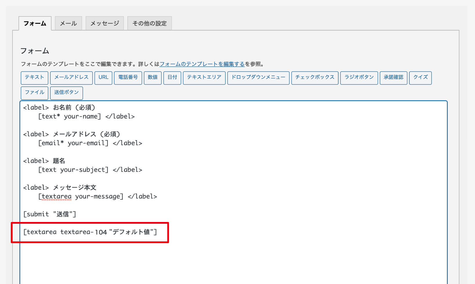 [textarea textarea-104 "デフォルト値"] と、前タブ「フォーム」で設定したショートコードをそのまま記載しても反映されませんので、気をつけましょう。