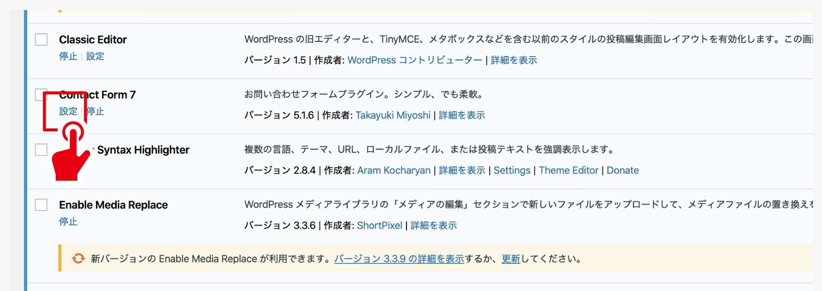 それでは、Contact Form 7のインストールをして「有効化」ができましたら、「設定」ボタンを押しましょう。