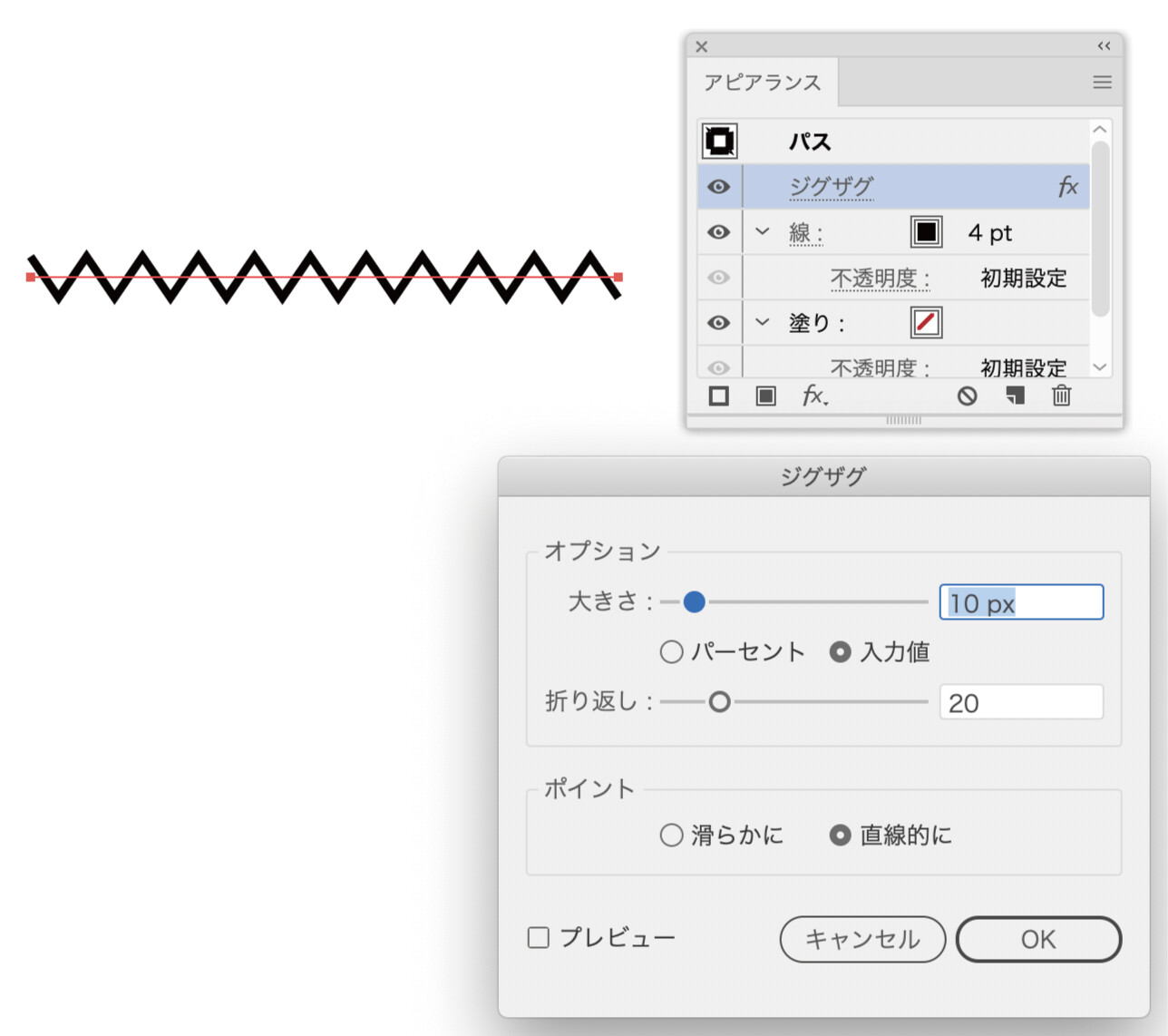 アピアランスとは、「外観」「うわべ」などの意味で、実際にパスを変形させたり・生成したりする事なく、バーチャルの状態でデザイン変更や装飾をしていく事ができる機能です。