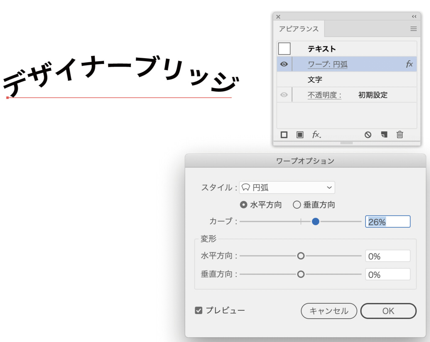 「円弧」「下弦」など色々ありますが、「ワープオプション」を調整する事で様々な形状にもする事ができますので、プレビューで確認しながら、自分のしたい形状になるように調整していきましょう。