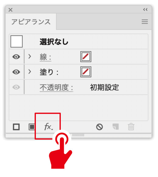 それでは、fxの紹介をしていきますね。基本的にはアピアランスパネルから効果を与えていく形になります。