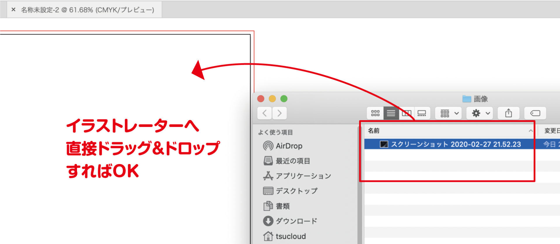 Illustratorのファイルを開けている状態で、フォルダなどにある画像をドラッグ&ドロップすれば完了です。