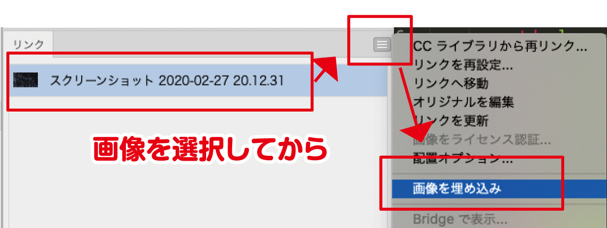 そこから、一つは「リンクパネル」の右上にあるメニューの中に「画像を埋め込み」というのがありますのでそれを押せばOKです。