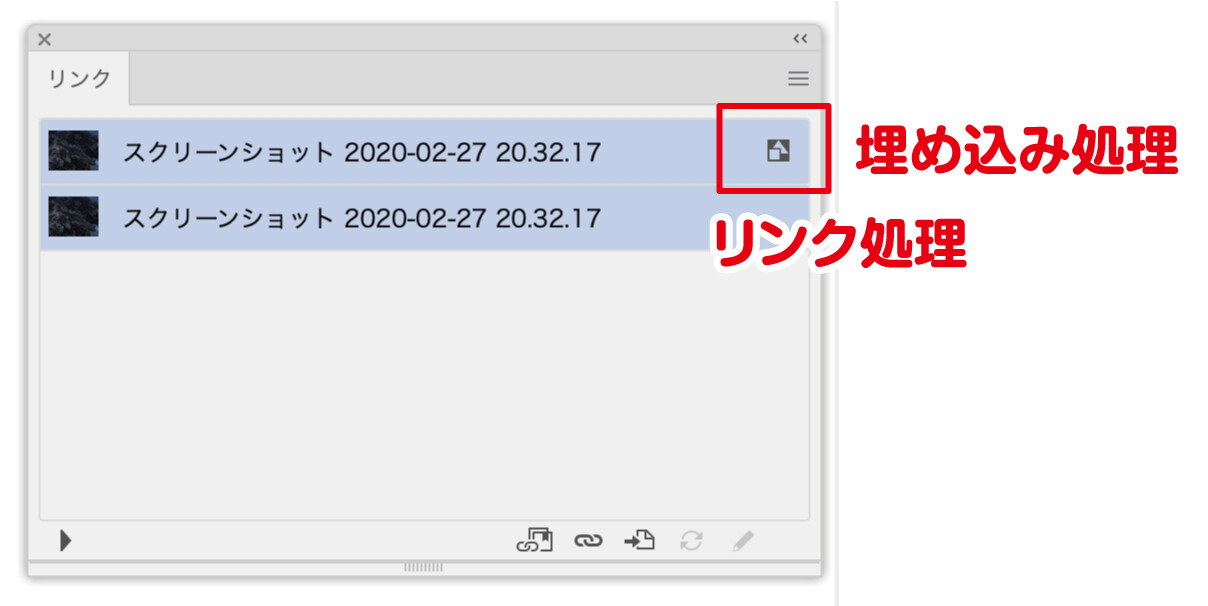 もう一つは、リンクパネルにて確認するのですが、埋め込みされている画像には右端に四角のマークがつきます。リンク処理の場合は何も表示されません。