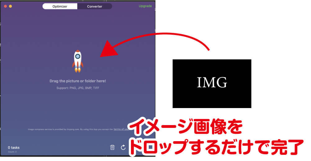 アプリが起動されると、以下の画面が出るので、そこに対象画像をドロップするだけで圧縮完了です。とっても簡単ですね。
