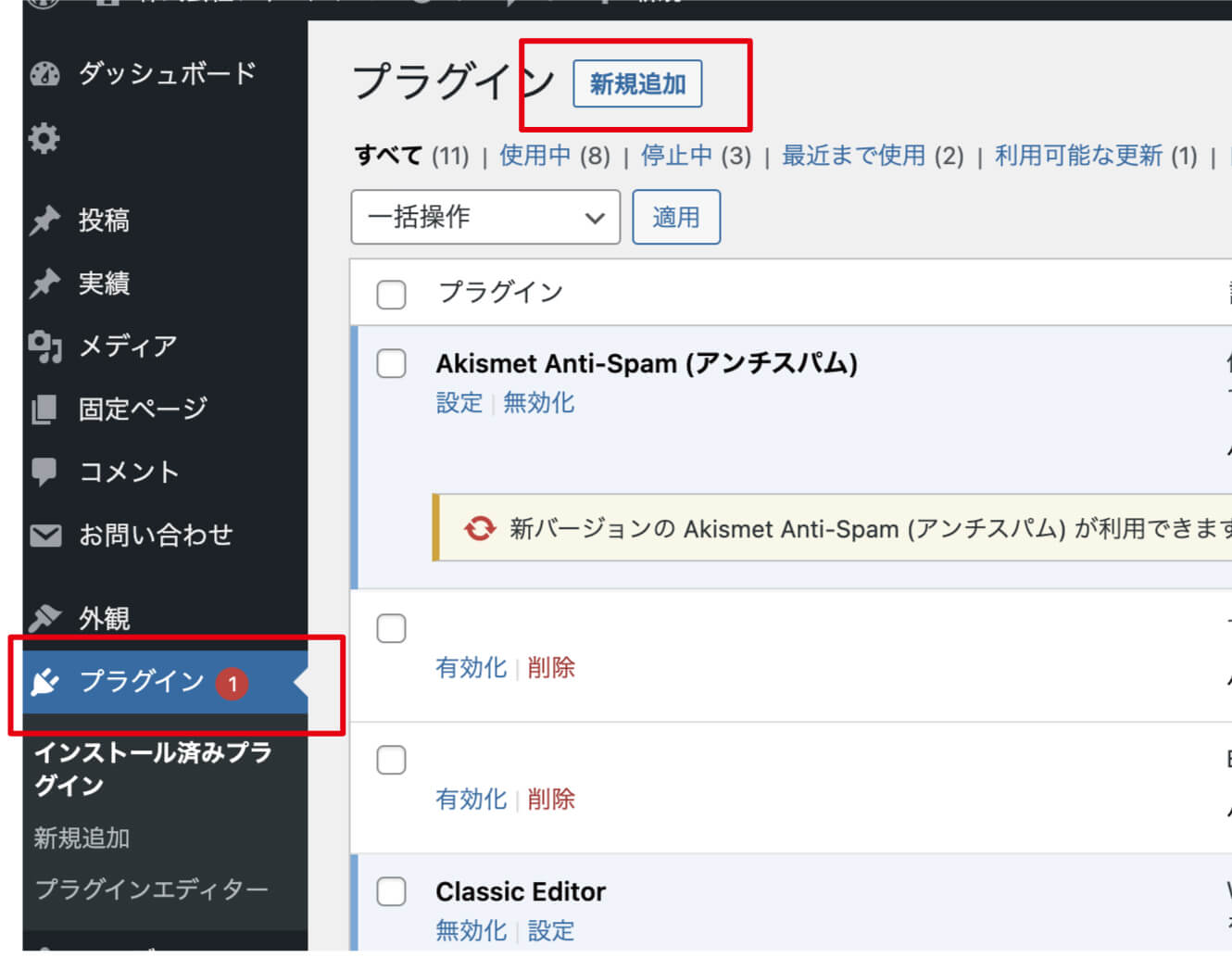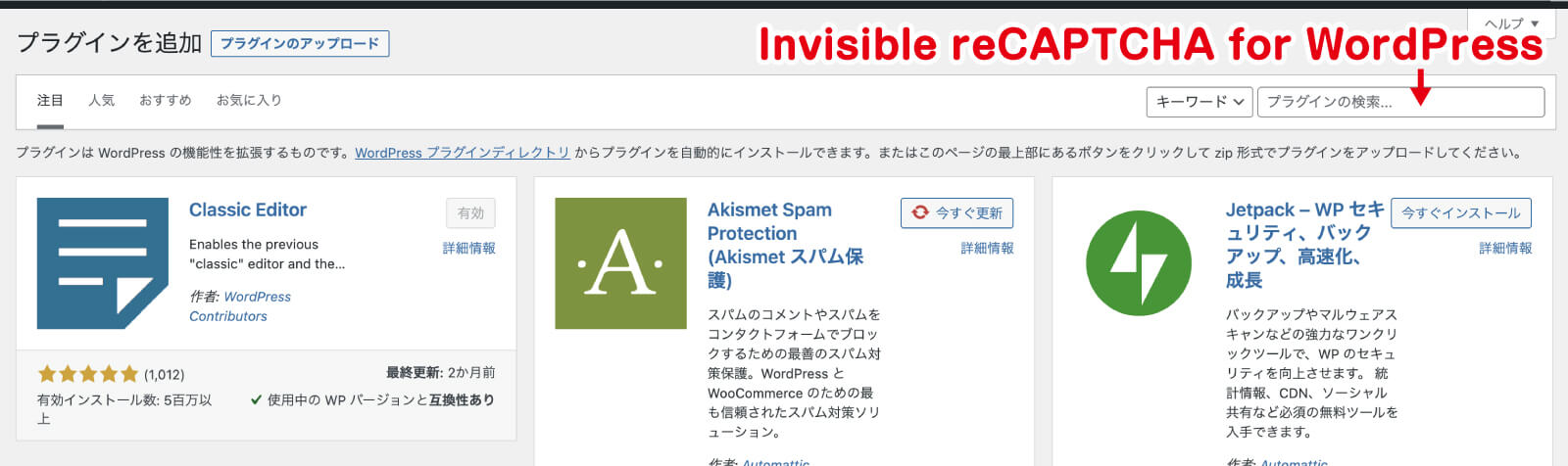 「プラグイン」→「新規追加」を押して、検索キーワードに「Invisible reCAPTCHA for WordPress」と入れて、「有効化」させましょう。