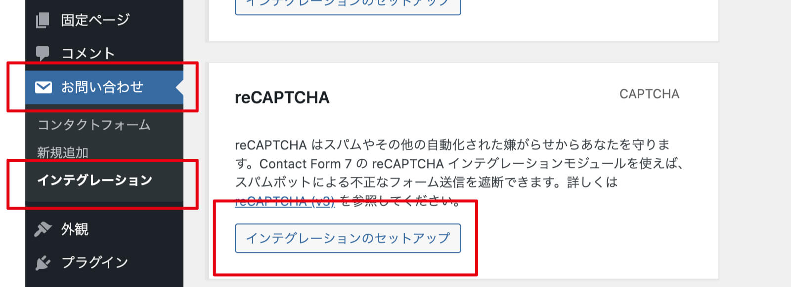 対象箇所は、「お問い合わせ」→「インテグレーション」の中にあります。