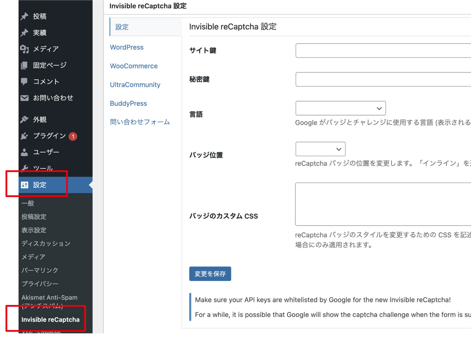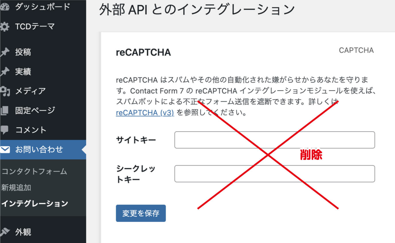 もうすでに、リキャプチャの登録をWordPressにしている場合は設定を削除しましょう。