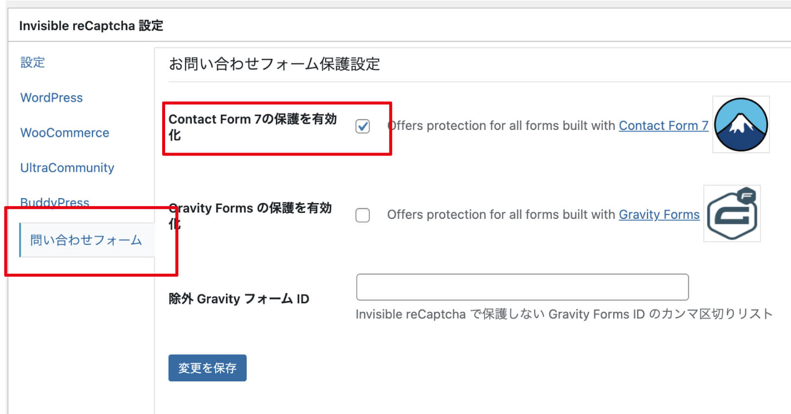 「Contact Form 7」以外のフォームにも対応しているようですが、今回は「Contact Form 7」にだけ有効にしたいので、「Contact Form 7の保護を有効化」にチェックを入れて、「変更を保存」を押せば完了です。