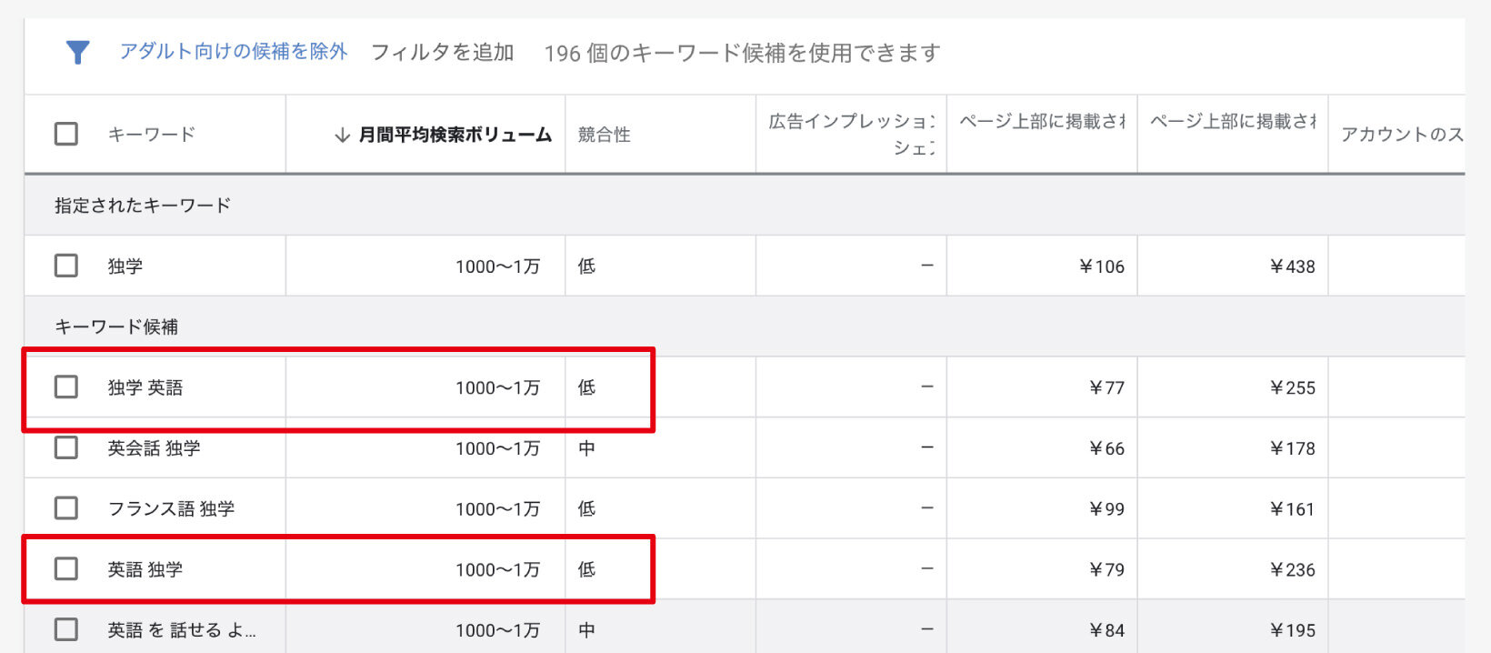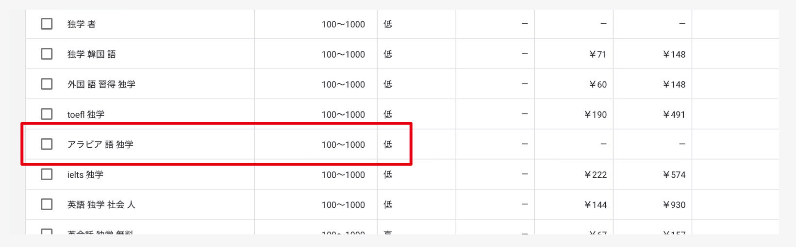上位で「独学 英語」「英語 独学」というのがあります。対して、「アラビア語 独学」では0ではありませんが、10/1の検索ボリュームになります。ですので、「語学の独学の記事を書こうと検討しているけど、何語にしようかな?」と迷っているのならば、「英語」をターゲットにするのと「アラビア語」をターゲットにするのでは、需要量が最初から10/1ほど差があるということになります。ですので、単純にページビュー数だけを求めるのであれば、アラビア語を軸に記事を書くというのはミス判断になります。しかし、何を目標にしてサイト運用をするのかにもより、その選定判断は変わってくると思いますので、検索ボリュームの結果はあくまで目安であるということは忘れないでおきましょう。
