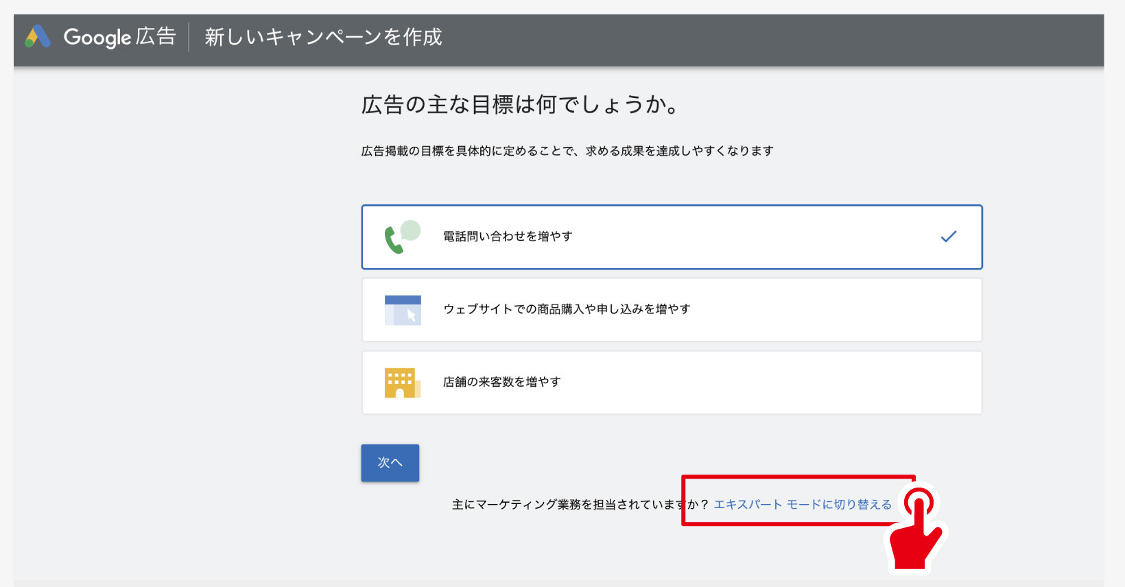 中央右の「エキスパート モードに切り替える」を押しましょう。