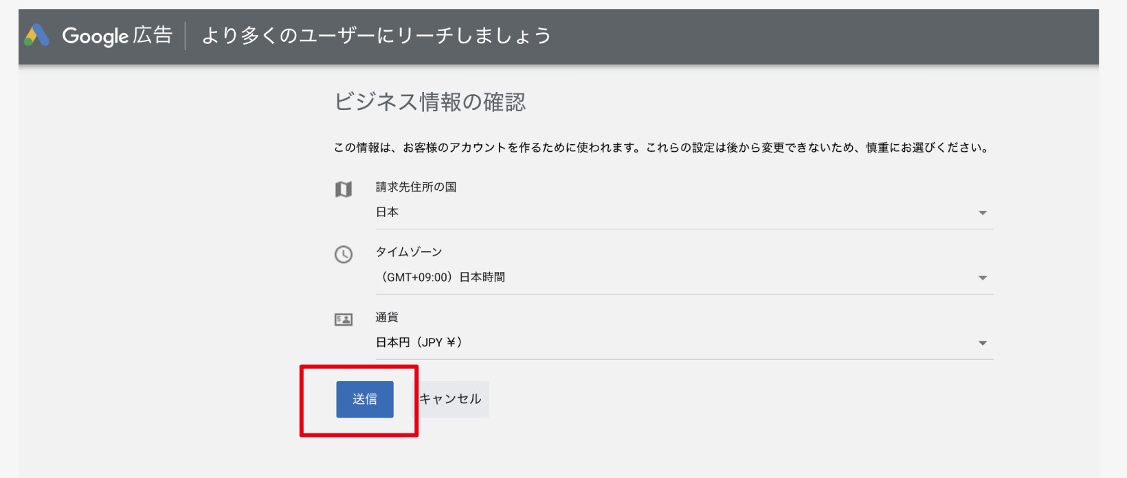 「ビジネス情報の確認」ですが、特に変更する必要はないのでそのまま「送信」を押しましょう。