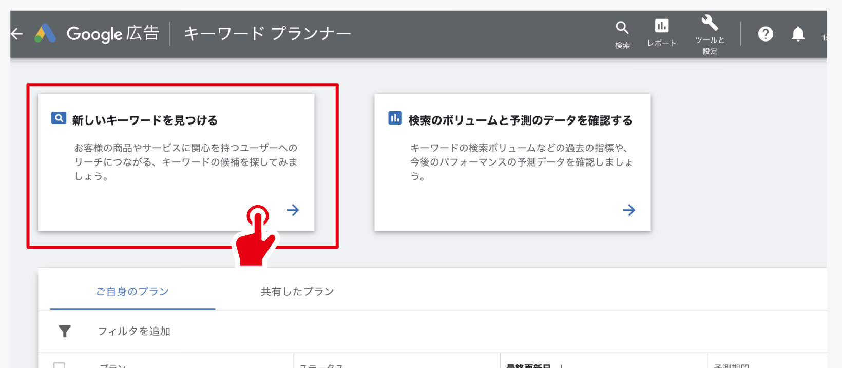 この画面からキーワードを検索する事が可能です。左上の「新しいキーワードを見つける」を押しましょう。