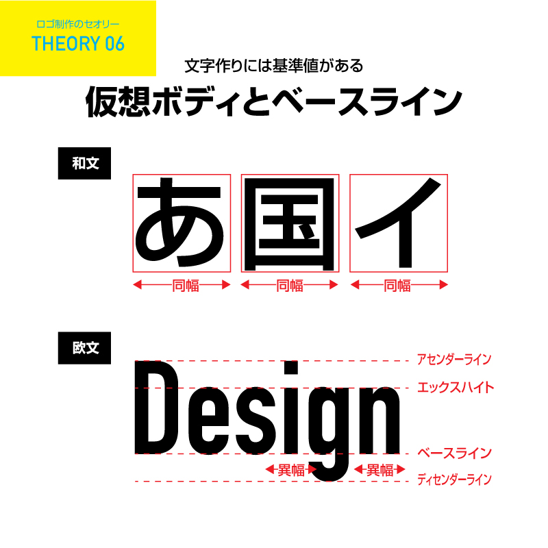 欧文にはボディはないので、横幅に関しては明確な基準値はありませんが、縦方向にライン設定(エックスハイト、アセンダーライン、ディセンダーラインなど)があるので、それらをきちんと守ることで、統一感をはかります。