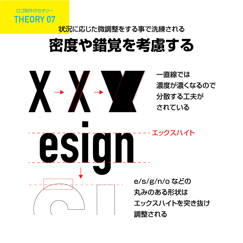洗練された文字を作るために、密度や錯覚によって、いろんな微調整を行う事があります。有名なところでは、Xの交点、eなどの丸みのある文字です。
