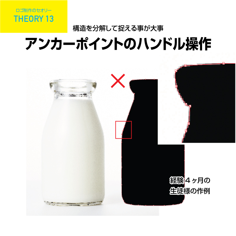 こちらは、私の生徒さんに実際に牛乳瓶のトレースをしてもらった時のパスの状況です。根本的にパスの数が多いので、歪になりやすいです。