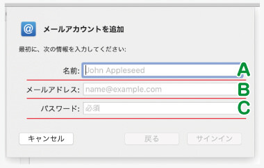A 名前:そのメールアカウントに名前をつけてあげましょう。(後で変更も可能です。)