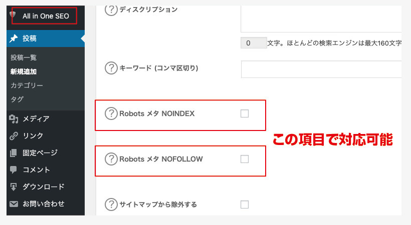 もしサイト運営に対して、「All in One SEO Pack」をすでに使っているのであれば、各投稿ページにて個別に「noindex」処理が可能になります。