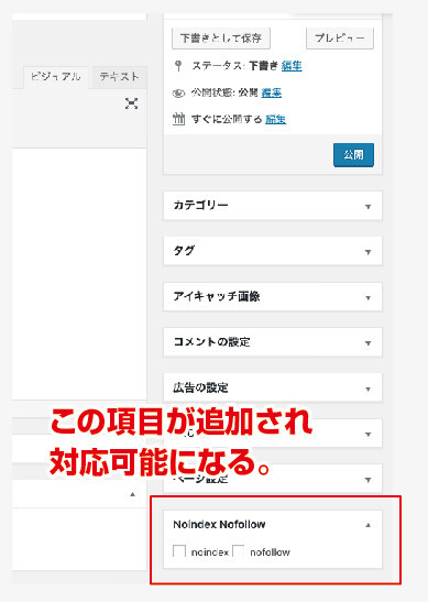 ちなみに「noindex」「nofollow」処理に関して、テーマによっては最初から記事投稿作成欄に項目が設けられているものがあります。