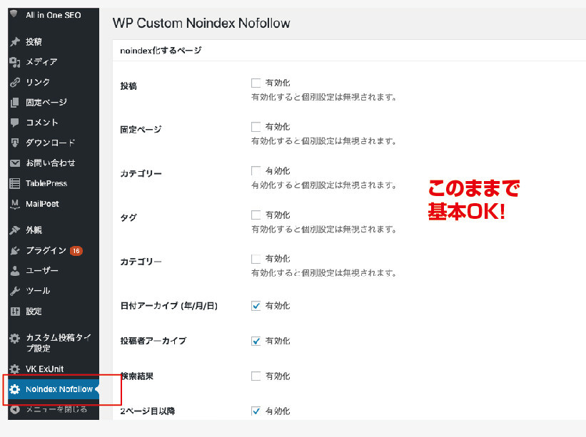 間違えて、なんとなく「noindex」のところにチェックを入れてしまうものなら、なんの為に導入しているか本末転倒も甚だしいです。