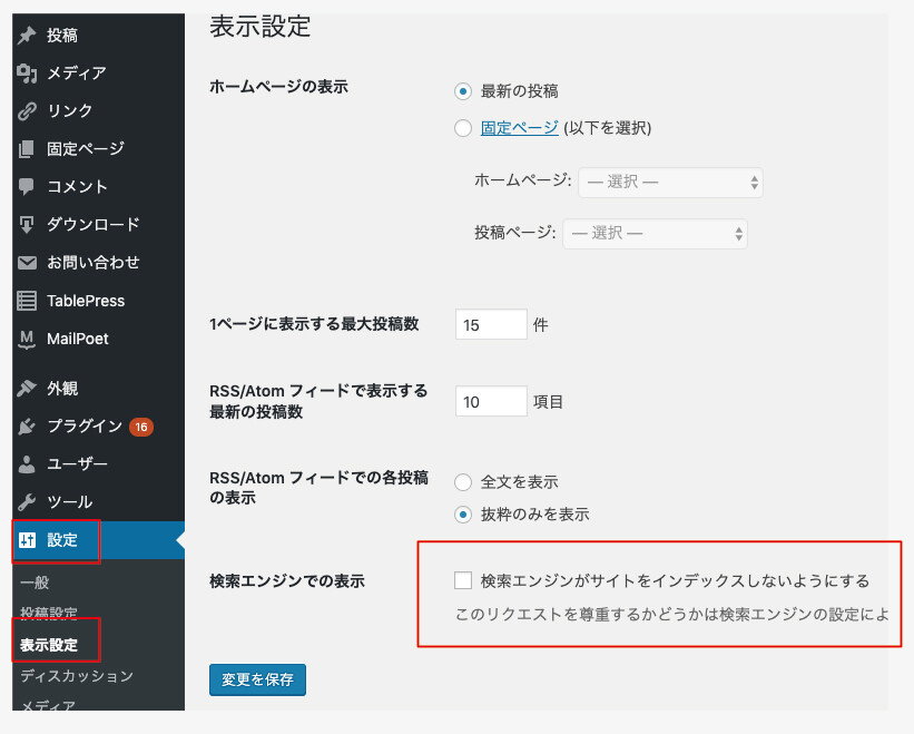 サイト全体に「noindex」「nofollow」指定したい場合は、「ダッシュボード」の設定から根こそぎ「noindex」処理しましょう。
